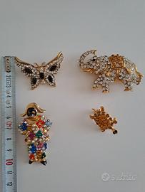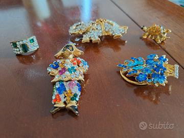 BIGIOTTERIA NUOVA: spilla arlecchino 25 euro, spilla elefante 25 euro, due spille tartarughina 10 euro l'una, anello smeraldo e brillanti 15 euro, pantera 10 euro (mancano 2 brillantini), bigiotteria "Idemaria". Farfalla e cestino azzurro, venduti. Vendo singoli pezzi. Tutto il lotto 80 euro.