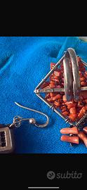 - Gli orecchini hanno pendenti a nappina con corallo e dettagli neri.