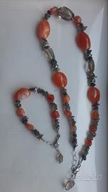 Parure collana in corniola arancio e quarzo fume' con mollettone in argento abbinata a bracciale con stessi materiali