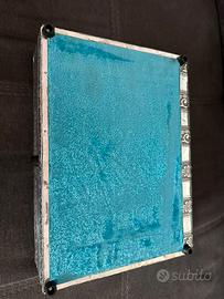 Scatola porta Gioielli in argento. Foderata in velluto celeste. Nuova, mai usata. Dimensioni chiusa: 27x21x7 cm.
