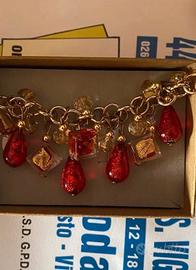 •Braccialetto con catena dorata e ciondoli in vetro rosso e trasparente con foglia oro