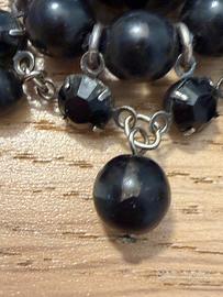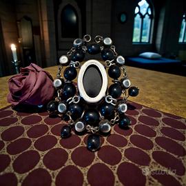 C’è qualcosa di ipnotico nei gioielli che non vogliono essere rassicuranti. Questo pendente ne è un esempio perfetto. Al centro, un volto femminile di profilo, inciso in profondità come le antiche gemme romane: non emerge, ma affonda. Lo sguardo non viene incontro, resta altrove. È un intaglio, non un cammeo tradizionale, e già questo racconta una scelta precisa. Attorno, una doppia corona di elementi neri: perle lisce, paste sfaccettate, piccoli pendenti che oscillano appena. Alcuni segni del tempo restano visibili, come accade nei gioielli vissuti davvero, composti e ricomposti, portati e adattati. Piccoli anellini sono stati sostituiti, la perla finale ha la coloritura sbiadita. La montatura del cammeo è in argento, con un sistema a doppio anello pensato per mantenere il pendente sempre stabile sul petto. Le dimensioni importanti lo rendono un pezzo di presenza, quasi teatrale, nato per essere notato senza chiedere permesso. È un gioiello che parla il linguaggio del Novecento più colto: quello che guarda all’antico, ma usa materiali moderni; che mescola vetro, argento e resine plastiche senza gerarchie, seguendo solo l’effetto finale. Un dichiarazione di stile.