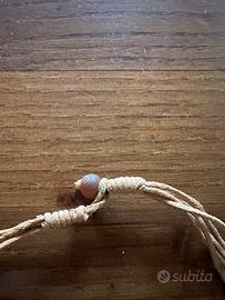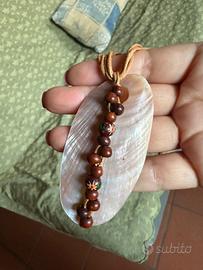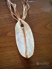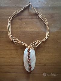 Girocollo con conchiglia, laccetti in corda e sferette in legno. Misura girocollo 50 cm. Misura ciondolo 8 cm.
