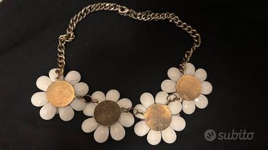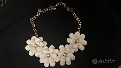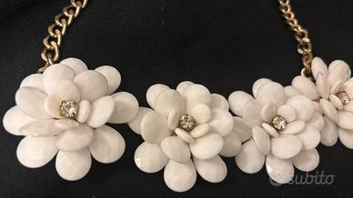 Accesdorio di grande effetto ! Collana con catena in metallo e 4 fiori bianchi con petali in materiale plastico multisfaccettato che crea eleganti effetti di luce. Da provare !