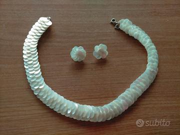 Elegante collana girocollo a dischetti rotondi di madreperla (o conchiglia di abalone) coordinata con gli orecchini a clips.