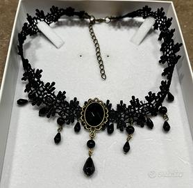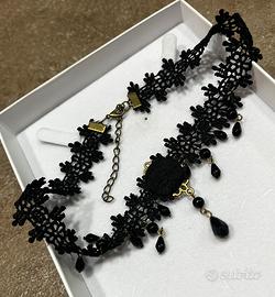 Vendo girocollo da donna, realizzato in pizzo nero di alta qualità, il gioiello perfetto per le amanti dello stile gothic, dark e vittoriano. Presenta un raffinato motivo a pizzo che avvolge delicatamente il collo, arricchito da una serie di affascinanti pendenti a goccia in perle nere e cristalli sfaccettati. Materiale: Pizzo nero, perle sintetiche nere, cristalli neri sfaccettati. Colore: Nero intenso, ideale per abbinamenti sofisticati. Design: Pizzo intricato con pendenti a goccia che donano movimento ed eleganza. Chiusura: Gancetto metallico regolabile sul retro, per adattarsi a diverse misure di collo. Misure: Lunghezza regolabile (da 33cm a 40cm). Lunghezza pietra centrale 5,77cm. Larghezza pizzo 3cm. Condizioni: Nuovo, mai indossato Perfetto per feste a tema, serate eleganti, eventi dark, cosplay, o per aggiungere un accento audace e distintivo ai tuoi outfit casual. Vendo anche orecchini da abbinare. Spedizione veloce 📦