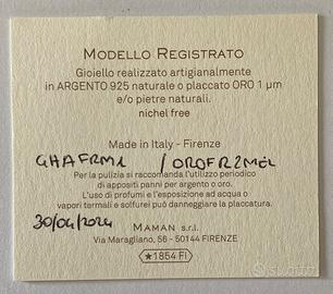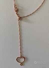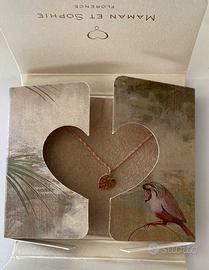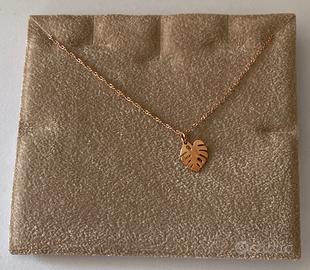 Collana girocollo realizzata con catena di argento 925 placcato in oro rosa ad alto spessore ed alta resistenza. Maglie ritorte. Foglia monstera in lastra pendente di 10 mm. La dimensione della circonferenza è regolabile grazie alla piccola sfera scorrevole fino ad un massimo di 43 cm. Chiusura a moschettone. Il prodotto è nuovo, originale e mai indossato, munito di confezione originale ed in ottimo stato. Sono gioielli Maman et Sophie realizzati artigianalmente in Italia e nichel free. Nella confezione è presente il certificato di autenticità e le istruzioni di conservazione (prezzo inferiore rispetto al mercato)