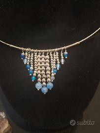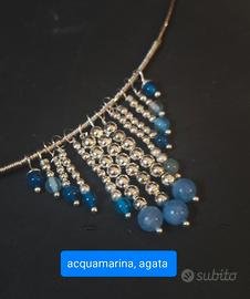 girocollo rigido catenella posteriore con moschettone pendenti al centro di agata, acquamarina e sferette un acciaio, fatto a mano da me