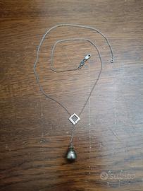 Girocollo sottile in oro bianco 750, 18 Karati e ciondolo pendente con perla grigio scuro. Punzone ben visibile sul moschettone e anello di congiunzione.