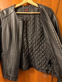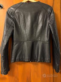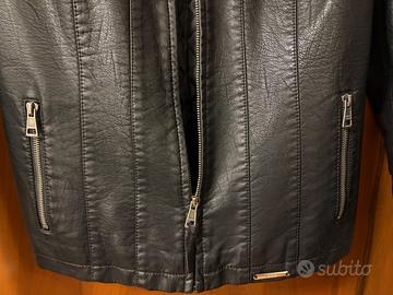 Vendo giubbotto biker nero, con chiusura con cerniera, due tasche anteriori e zip sulle maniche. Il collo, come si vede nella foto, nella parte posteriore presenta segni di usura dovuti al tessuto eco-pelle.