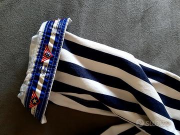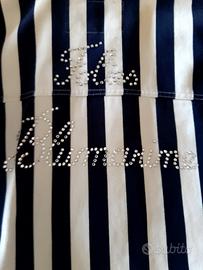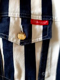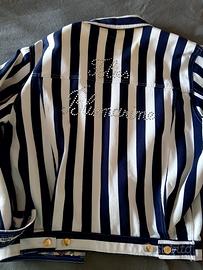 Giubbino Blumarine folies a righe verticali bianco blu taglia 46 ottimo stato , con logo in strass bottoni dorati maniche ampie., risvolti maniche e bordo interno con scritta . Per info sono a disposizione.