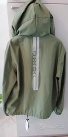 Giubbino sfoderato Bomboogie nuovo, 100% poliestere cuciture termosaldate, cappuccio foderato regolabile, 2 tasche esterne con zip, fondo regolabile, striscie e scritte catarifrangenti sulla schiena e spalla sinistra. Color verde oliva taglia S, larghezza spalle 48, larghezza ascelle 56, lunghezza spalla bordo manica 65, lunghezza spalla fondo 61. Nuovo, mai indossato, prezzo di listino 119 euro come da foto.