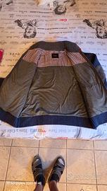 Giubbino di lana di colore blu scuro, modello casual imbottito con 2 tasche esterne e toppe originali sui gomiti. Veste come una 2XL.