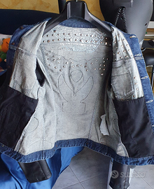 Vendo giubbino di jeans firmato. È molto particolare. Ha le maniche in pelle e ci sono borchie e ricami, davanti e dietro.