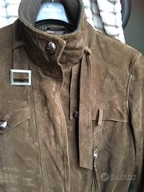 Giacca in vera pelle scamosciata, LeFull tg S donna morbidissimo, marrone, foderato con frange alle cerniere eventualmente staccabili ,cinturino al collo rimovibile , collo interno in maglia , 2cinturini al fondo chiusi con bottone automatici polsini e fondo in maglia pesante
