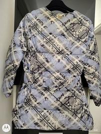 Giubbino in piuma d'anatra di Roberto Cavalli con una bella fantasia, colore predominante viola lavanda.Cinturino con la fibbia a forma di serpente, maniche a tre quarti.Tagglia 42,in ottime condizioni, indossato un paio di volte.Non inPost.