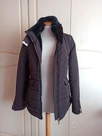 giubbino giubbotto donna imbottito con collo in pelliccetta e cappuccio leggero piegato dentro il collo. La chiusura è un po' forzata ma è così dall' inizio . Mai indossato.
