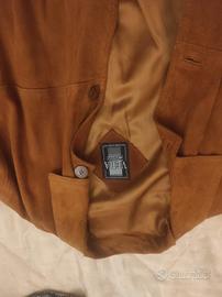 Giacca in vera pelle scamosciatadi colore marrone chiaro o ruggine, con un'etichetta del marchio "VERA".