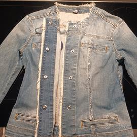 Giubbino vintage in jeans primaverile Lui Jo con bottoni a pressione. Veramente bello riporta lungo alcuni tratti la presenza di pietre (brillantini) sintetiche con qualcuna assente. Taglia 42