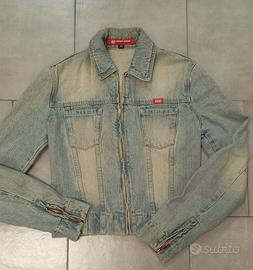 Giubbino di jeans corto con chiusura cerniera anche su maniche e stampa papaveri su schiena