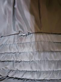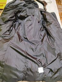 giubbino nero da donna, con cappuccio, al di sotto del ginocchio, imbottito, misura: L; il giubbino presenta due tasche laterali e una cerniera color oro; presenta qualche imperfezione nella cucitura e qualche striatura più chiara come mostrato dalle foto
