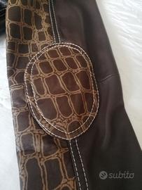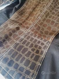 Bella giacca tipo biker, in morbida nappa di agnello marrone, in parte stampata coccodrillo "used". Chiuso con zip. Cuciture bianche. Polsino. Due tasche inserite chiuse da zip. Toppe cucite ai gomiti.