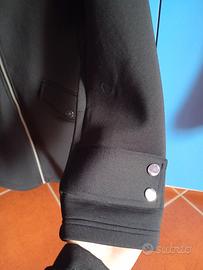 giacca dal taglio dritto, non svasato, chiusura con cerniera e tasche con bottoni a clip. le stesse clip presenti sulle maniche a chiudere una fascia sul polsi. il tessuto è sintetico, molto piacevole e liscio, non si stropiccia e non fa pallini! ha un ampio cappuccio comodissimo per il vento e la pioggia. la taglia è M ma potrebbe vestire anche una L. spalle 40cm ascelle 50 cm lunghezza 85 lunghezza manica 63
