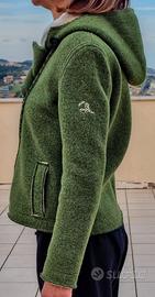 Giubbino in lana cotta verde salvia. Unisex. Taglia 14 anni. Calza come una S da donna. Larghezza spalle 44 cm, ascelle 48 cm. Lunghezza totale 57 cm. Manica 57 cm. Due taschine laterali. Cappuccio con bottone. Zip obliqua sul davanti. Indossato 2 volte. Praticamente nuovo