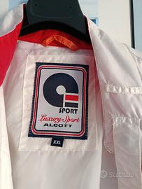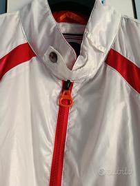 Giubbino sportivo bianco e rosso con cerniera centrale 2 nelle maniche e 2 nelle tasche. Tasche interne il collo si chiude fino in alto con bottone automatico marca Alcott tg XXL ma vi dò le misure da ad ascella cm 51 lunghezza totale cm 71. Adatto per tutto ciò che si fa all' aria aperta. Si asciuga subito e ripara dal vento soprattutto si piega ed entra anche in un piccolo bagaglio. Regalo nel pacco