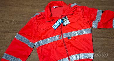 Giacca da intervento marca Rescue Force, mai indossata. Trattamento idrorepellente, rosso fluo alta visibilità a norma EN471, bande rifrangenti Reflexite, maniche staccabili.