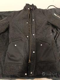 Design: Chiusura frontale con zip e bottoni a pressione, colletto alto protettivo e iconica placchetta metallica logata sul retro.