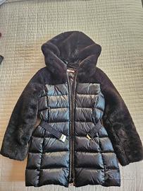 piumino lungo imbottitoin nylon con inserti in pelliccia sintetica. Imbottitura in piuma. Cintura elastica logata con fibia. usato poche volte, come nuovo. Piccolo graffio sulla fibia ( come si vede dalla foto). Taglia 10 anni / 140 cm.