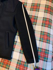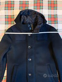 Giubbotto di colore blu con cappuccio taglia S. Misure: spalla cm54- maniche cm62- lunghezza cm64, 70% poliestere,30% lana. Non ha tasche interne. Pari al nuovo, mai usato.