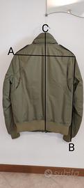 Giubbotto bomber invernale Ralph Lauren in stile militare, taglia S, in cotone, imbottito in piume d'oca; zip frontale a doppio cursore, due tasche esterne chiusura con bottone a pressione, una tasca sul braccio con chiusura a zip, due tasche interne con bottone a pressione, rigorosamente originale. Misure di riferimento: A spalle = 46cm B manica = 64cm C busto = 72cm