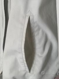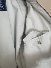 Vendo splendido giubbotto bomber vintage originale Burberry, un pezzo iconico dal design senza tempo. Il capo si presenta in una raffinata tonalità bianco avorio/panna con dettagli (colletto, polsini e fondo) in maglia a coste color grigio chiaro a contrasto.