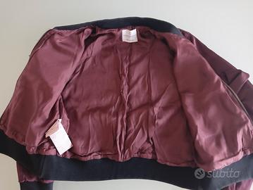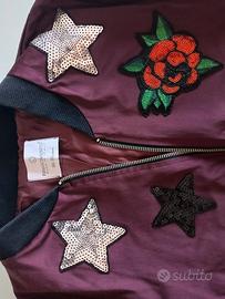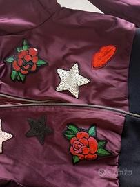 giubbotto donna color prugna con evidente lustrini forma di stella rosa e una bocca rossa