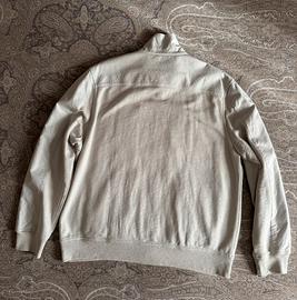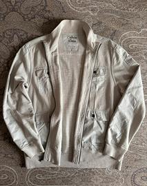 Giubbotto in cotone color panna/avorio, dalla linea essenziale. Presenta chiusura frontale con zip, collo alto leggermente sagomato e quattro tasche applicate sul davanti con patta e bottone, che richiamano uno stile utility rattinato. Polsini e fondo rifiniti a costina per una vestibilita confortevole. Il tessuto appare morbido ma consistente, ideale per la mezza stagione.