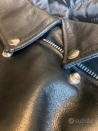 Originale giubbotto “chiodo” in pregiata pelle bovina pieno fiore. Realizzato in Germania da BOHMBERG Berlin. Pelletteria e finiture di alta qualità. Cerniere JKK Japan in metallo. Bottoni a clip in metallo. Vero giubbotto da moto con tasche interne per inserire le protezioni su spalle e gomiti. Taglio “chiodo” originale stile Marlon Brando. Colore nero. Misura XL.