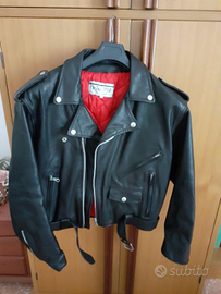 Vendo giubbotto chiodo in pelle nera made in Italy, con interno a trapunta rosso, originale anni '90, taglia L.