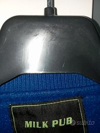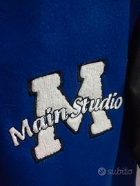 Questo è un giubbotto stile varsity (college), con un design sportivo e casual. La parte principale del giubbotto è di colore blu acceso, mentre le maniche sono nere, realizzate in un materiale diverso che sembra imitare la pelle. Sul lato sinistro del petto è presente una grande "M" bianca con la scritta "Main Studio" sovrapposta. Il colletto, i polsini e l'orlo inferiore sono a costine, tono su tono con il blu del corpo centrale. L'etichetta interna riporta la marca "Milk Pub" e la taglia è *L (Large)*. Il giubbotto ha uno stile giovane, ideale per un look urbano e rilassato.