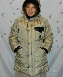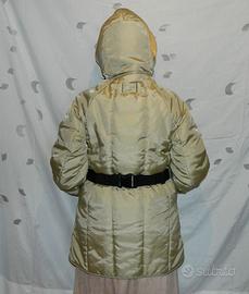 Giubbotto da donna Rifle Jeans, taglia M, trapuntato verticalmente, cappuccio incorporato con serraggio a laccetto, girocollo con pelliccia e velcro, chiusura a zip bidirezionale con patta e bottoni a pressione, cintura con fibbia su vita, tre tasche esterne di cui una con patta e bottone a pressione, esterno 100 % poliammide, fodera 100 % poliammide, imbottitura 100 % poliestere. Buone condizioni.