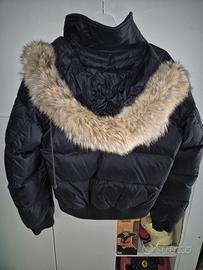 Ciao! Vendo questo giubbotto originale D&G Dolce & Gabbana vintage (probabilmente anni 2000), modello RB0161/TNMHM, limited edition con patch "Fighting for Peace Italia" sul petto (un vero statement di pace, raro e da collezionisti!). È un puffer bomber nero lucido in nylon, imbottito, con cappuccio bordato di pelliccia vera di coyote (removibile?), collo alto a costine, zip frontale, tasche laterali e polsini elastici.