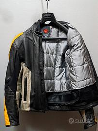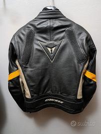 Giubbotto uomo da moto in pelle Dainese , colore nero/giallo/argento . Imbottitura interna staccabile, protezioni spalle e gomiti. Taglia 52 , ottimo stato , usato pochissime volte .