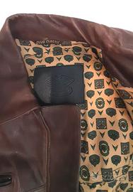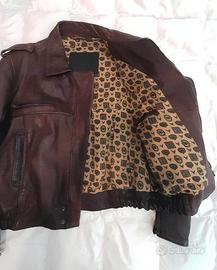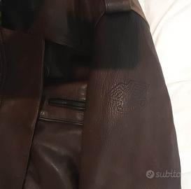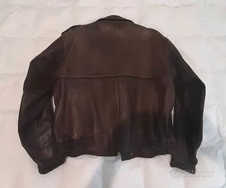 Giubbotto vintage di pelle vera, colore testa di moro anni '90, marca Traveller. Due tasche laterali e due pettorali. Numerose cerniere in ottone: chiusura principale, maniche, ascelle, tasche. Fodera interna con aperture in velcro per inserimento di imbottiture di protezione (non in dotazione): schiena, gomiti, spalle. Misure: torace 63 cm, altezza (retro) 66 cm, interno manica 52 cm, spalle 57 cm, vita 54 cm. Indossato pochissimo.