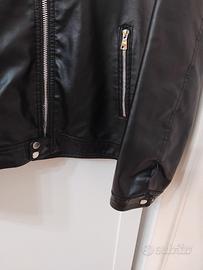 in ecopelle nera con zip argentate.collo a listino e cinta al bordo inferiore con bottoni,che sono pure