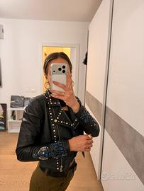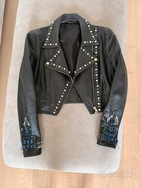 Giubbino in vera pelle nera, realizzato artigianalmente per una sfilata. Modello corto, con dettagli gioiello su colletto e maniche (zirconi e perline blu incastonati). Capo unico, molto particolare e d’impatto. Taglia S.