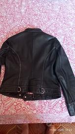 Giubbotto da donna in pelle nera con cuciture a vista bianche, modello biker, marca Conbipel, taglia 44. Perfetto per la mezza stagione.