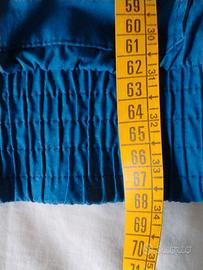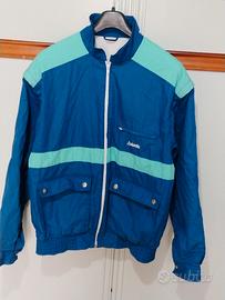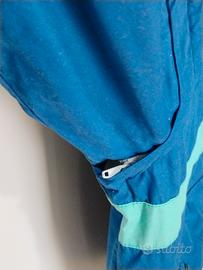 iconico giubbotto Dolomite turchese e verde acqua in misto poliestere e cotone , anni fine 80 circa , maniche staccabili con cerniera per trasformarlo in gilet, tasche con banchina e bottoni , toppe su maniche di colore contrastante , taglia L italiana , interamente foderato in cotone bianco tipo spugna ( leggermente pallinato ma niente di grave) condizioni ottime nonostante l' età .