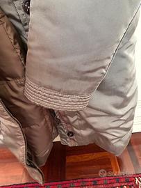 Caldissimo e leggermente sancrato con cappuccio amovibile e collo lavorato a crochet color grigio tortora in tessuto tecnico