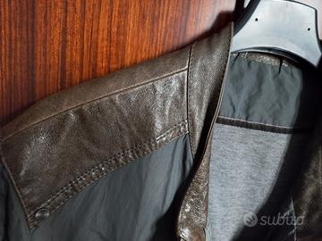 Giubbotto donna colore grigio con inserti in ecopelle, fine maniche e bordo cappotto in maglia larga grigia.